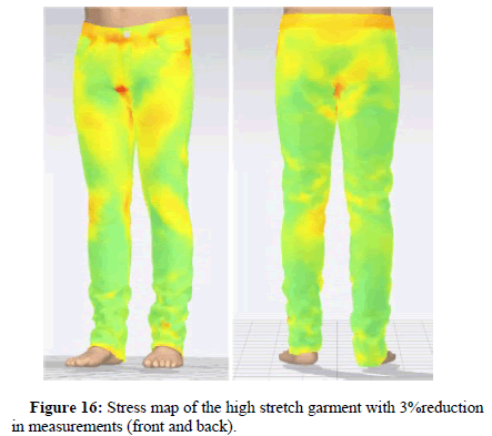 Two outfits were created where the girth measures of the mid-block were lowered by 3% in the first outfit and 4% in the second. The stress maps of these garments were studied to determine the optimal reduction percentage for fabrics with higher stretch percentages. The findings shown in Table 9 suggested that a 3% reduction in the midstretch block can be used for fabrics with stretch percentages of above 40% (Figure 19). Table 10 shows the final pressure readings of the garments made from 4 stretch brackets.