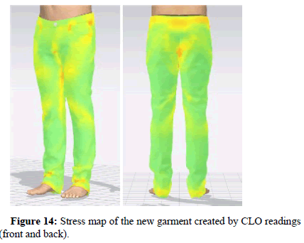 Implementation: The analysis of data acquired was used to create new specifications. The stress maps of the new garments were compared with the original before sample production. For a good fit of slim fit jeans, it is suggested that the pressure readings should be in the medium range of 33 kPa to 65 kPa, according to CLO 3D. To achieve desired fit, the central values from the average pressure readings were selected (Table 6). The corresponding measurements for the selected pressure reading were recorded, and a new garment was created using CLO 3D to evaluate its fit (Figure 14).