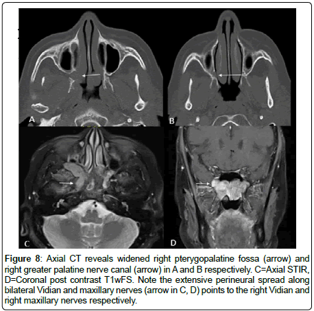 Figure 8: Axial CT reveals widened right pterygopalatine fossa (arrow) and right greater palatine nerve canal (arrow) in A and B respectively. C=Axial STIR, D=Coronal post contrast T1wFS. Note the extensive perineural spread along bilateral Vidian and maxillary nerves (arrow in C, D) points to the right Vidian and right maxillary nerves respectively.