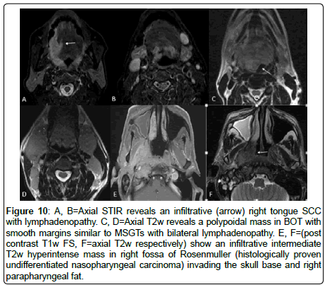 Figure 10: A, B=Axial STIR reveals an infiltrative (arrow) right tongue SCC with lymphadenopathy. C, D=Axial T2w reveals a polypoidal mass in BOT with smooth margins similar to MSGTs with bilateral lymphadenopathy. E, F=(post contrast T1w FS, F=axial T2w respectively) show an infiltrative intermediate T2w hyperintense mass in right fossa of Rosenmuller (histologically proven undifferentiated nasopharyngeal carcinoma) invading the skull base and right parapharyngeal fat.