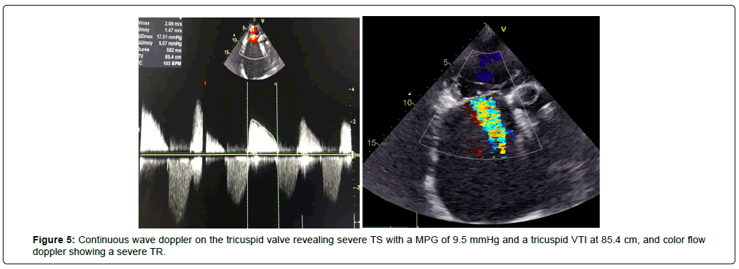 The physiopathology of this phenomenon can be easily explained when two valves are involved ; like it is the case for functional TR secondary to Right Ventricular (RV) dilatation and Pulmonary Artery Hypertension (PAH) in the setting of significant MS, however, in advanced MVD, let alone when all four valves are involved, the pathophysiology of valvular lesions and their evaluation remains very challenging. Such patients often have symptoms of Heart Failure (HF) and valvular lesions are usually accompanied by secondary hemodynamic effects on the cardiac chambers [11,12]. In our patient, fatigue and dyspnea were the only symptoms of left HF but no episodes of acute HF were noted, the LV being most likely protected by the diminished pulmonary blood flow resulting from the rightsided valve stenosis that provided relative compensation of more or less long duration, however, a rapid deterioration can be expected after right heart failure appearance.