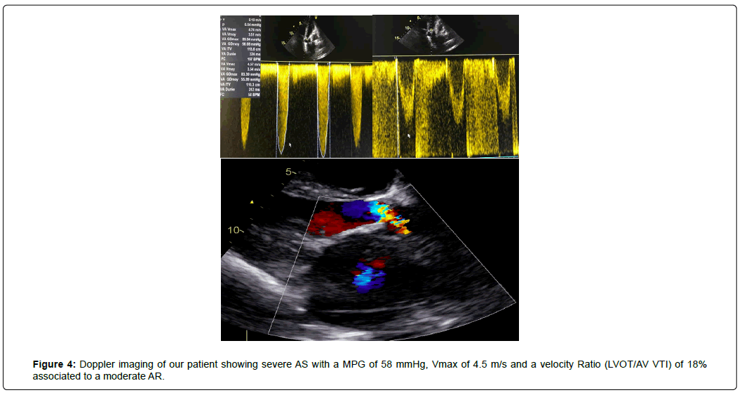 In addition to this, a severe Aortic Stenosis (AS) with a MPG of 58 mmHg, peak aortic valve velocity (Vmax) of 4.5 m/s and a velocity Ratio of 18% associated to a moderate Aortic Regurgitation (AR), were assessed (Figure 4).