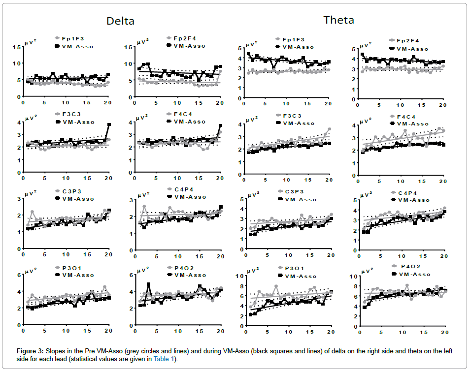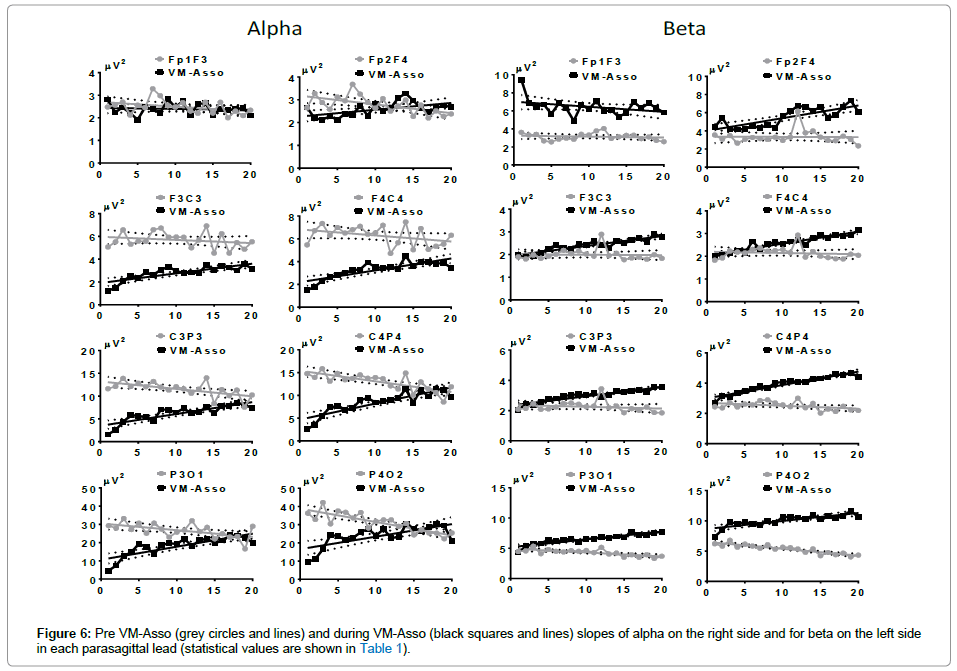The AP of alpha in the Pre VM-Asso condition generated descending slopes in all leads, which were steeper in CP and PO. During VM-Asso, no slope was generated in Fp1F3, but the slopes in all other leads were ascendant. All slopes started with a marked initial diminution and final values only reached the Pre VM-Asso values in C4P4 and P4O2 (Figure 6, right side).