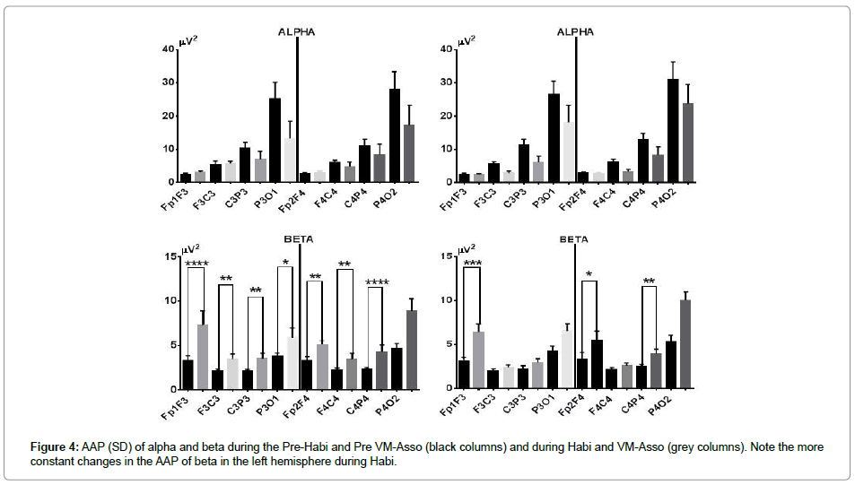 RPh increased beta’s AAP in all leads and the increment was significant with the exception of P4O2. VM-Asso induced a significant increase in FF in both hemispheres, with more intensity in the LH and in C4P4; the increase was recorded in all leads, but did not reach statistical significance (Figure 4, lower part).