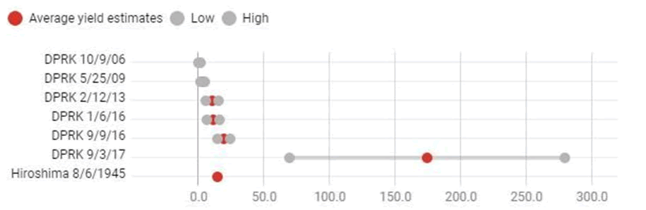 Chairman Kim Jong Un, North Korea's leader, is obviously not in a rush to demilitarize his nation. Kim paid a state visit to Moscow in April after two historic but ineffective meetings with President Trump, during which he made it plain that his country would not negotiate up its nuclear arsenal without international security assurances. On April 18, North Korea launched what looked to be short-range missiles. Figure 3 shows projected explosion yield for North Korean nuclear tests.