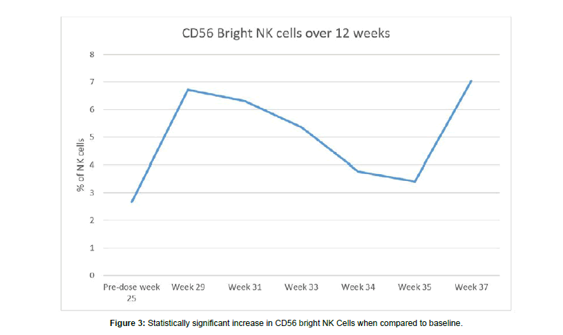 In addition, this report outlines the first use of Salmonella-IL2 in a multiple dosing strategy in a patient with metastatic pancreas cancer. Pre-clinical studies demonstrated synergism between Salmonella-IL2 and doxorubicin and various mechanisms for this synergism have been suggested. This patient demonstrated a significant increase in CD56bright NK cells, which have been shown to be one of the major subsets infiltrating some cancers and upon cytokine stimulation of this cell line, can undergo a significant differentiation into a highly cytotoxic NK cell. Despite having to stop a major component of the chemotherapeutic strategy, namely oxaloplatin, flow cytometry revealed that immunologic cell populations have been maintained. With these encouraging results, an expanded multiple dose Phase II trial of Salmonella- IL2 trial of up to 60 patients with metastatic pancreas cancer will be initiated.