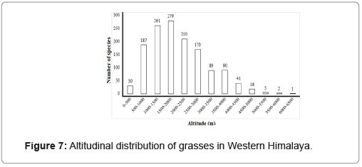 The maximum number of the taxa was found in UK (157) followed by HP (60) and J&K (45). Total 152 taxa were found commonly distributed over all the three states. Apart from this, 130 taxa were common among HP and UK, 22 taxa among HP and J&K and 16 taxa among J&K and UK (Figure 6). The maximum number of taxa was abundant between altitudinal ranges of 1500 m-2000 m, which declined further up to 6000 m (Figure 7). Species Pennisetum lanatum Klotzsch (2000 m-6500 m) and Stipa caucasica Schmalh (1000 m-5500 m) were found to have widest distribution along the altitudinal classes. Among the taxa occuring in the study area, about nine species have been found to be restricted to their locality viz. Calamagrostis gamblei Paszko, Dendrocalamus somdevae Naithani, Festuca nandadevica Hajra, Festuca sanjappae Chandra S. & Srivast., Helictotrichon uniyalii Kandwal & Gupta, Muhlenbergia rakchamensis Arum., Murthy & Nair Pseudodanthonia himalaica (Hook) Bor & Hubb., Stipa klimesii M.Nobis and Trisetum micans (Hook) Bor.