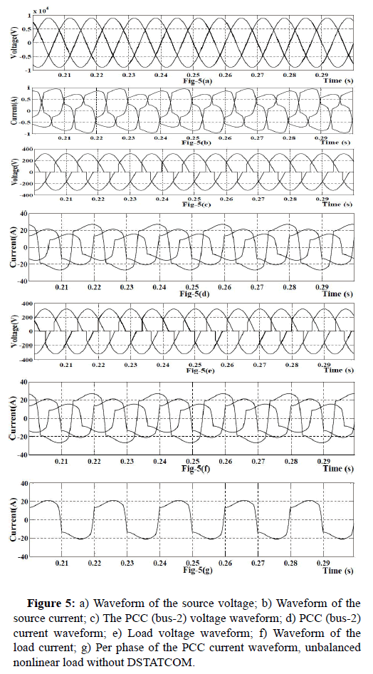 The unbalanced nonlinear load introduces harmonics in the source current waveform (bus-1) as shown Figure 5a and b. At the PCC, the voltage and current waveforms are distorted due to harmonics introduced by the unbalanced nonlinear load (bus-2) is observed from Figure 5c and Figure 5d. The load voltage and load current are observed in Figure 5e and Figure 5f. Figure 5g. PCC (bus-2) current waveform of phase-A, unbalanced nonlinear load without DSTATCOM.