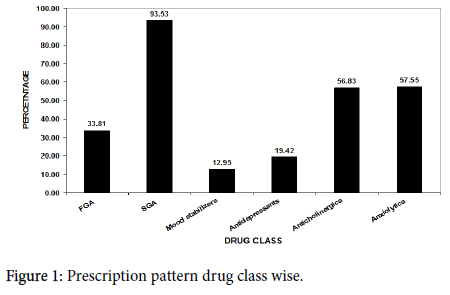 Acquaviva et al. study in the year 2002 in France showed 32.9% prescriptions for anticholinergics which were less than our study but a study by Fourrier et al. in the year 1996 in France shows 86.1% prescription for anticholinergics and Ungavari et al. in the year 1996 study in Hong Kong shows 61.8% which were higher than our study [31,36,38]. Study by Fourrier et al. showed 52.3% prescriptions for anxiolytics which was comparable to our study [36]. Anticholinergics are routinely used to treat extrapyramidal symptoms that may occur in most patients’ receiving neuroleptic treatment.