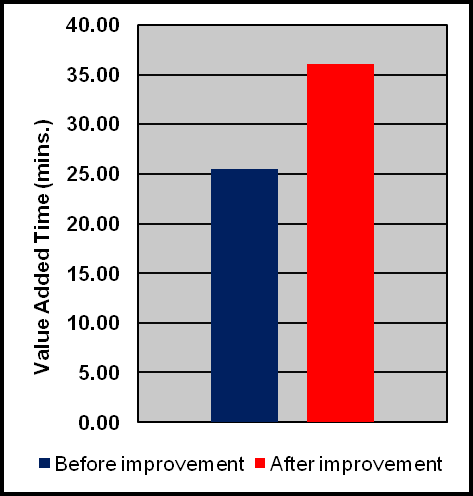 Simulation of the modified situation indicated reduction in the waiting time and numbers waiting for all the activities in the winding section by half. The total output of the assembly line increased to 169 units, as shown in Appendix 3; increasing the productivity by 33%. It can also be noted that the utilization of all resources in the winding section is brought down from 100% indicating a reduction in the overload and the numbers waiting has been reduced by 50%. It should be noted that additional resource deployment was not suggested as a straight forward solution but on the basis of a thorough analysis of the job content of various workers, work load balancing, analysis of human factors and multiple rounds of discussions with the plant head and top management. The value-added time for the entire assembly process increased from 25.49 to 36.12 minutes, all these improvements are represented graphically in Figures 10-12.