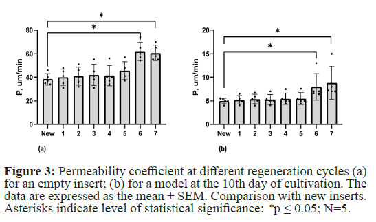 To determine the impact of piranha solution treatment on the barrier properties of BBB models and the culture inserts themselves, we measured the permeability coefficient for the fluorescent dye Lucifer Yellow. We measured the barrier properties for new inserts as well as after 1-7 regeneration cycles. Inserts with visible membrane damage under the microscope were not used. It is worth noting that after each regeneration cycle; approximately 10% of the membranes were damaged. The permeability of both the model inserts and the empty inserts coated only with collagen did not change compared to the new inserts until the fifth regeneration cycle. However, starting from the sixth cycle, statistically significant differences were observed in both the empty inserts and the BBB models. Therefore, up to 5 regeneration cycles, there is no statistically significant difference in the permeability coefficient for both the empty insert and the BBB model constructed on it (Figure 3).