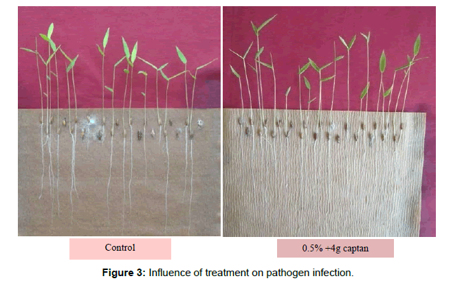 Appropriate seed treatment can help in minimizing the carryover of fugal inoculum to seedlings and subsequently to the field. In the present study, pathogen infection was low (5%) in 1 h 0.5% Bavistin soaking+4 g Captan dry dressed seeds and recorded higher germination (78%) (Table 1 and Figure 3). When the seeds were treated with single fungicide either Bavistin (T4 and T5) or Ridomyl (T3) they failed to arrest the fungi completely, however fungal load was reduced from 39 to 20% in Ridomyl and to 27% in Bavistin treatment. The combination of Bavistin and Captan either as soaking or as dry dressing taken care of infection; at higher dosage of 4 g of Captan along with 0.5% Bavistin soaking was effective against storage fungi. This reduced the infection to 5% without affecting the germination. The results of present study are in accordance with the findings of Ibiam et al [15].