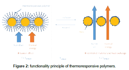 The Figure 1 shows the challenges of a clothing system and Figure 2 show this reversible process in principle. The interdisciplinary project team started in 2015 with the screening of commercialized thermoresponsive polymers, design and synthesis of new polymers. It then went on to the screening and chemical functionalization of suitable substrates through surface treatment and application of polymers on substrates. At the moment, the testing and optimization of functionalized samples is ongoing. In order to define the LCST range a study on the microclimatic conditions was performed.