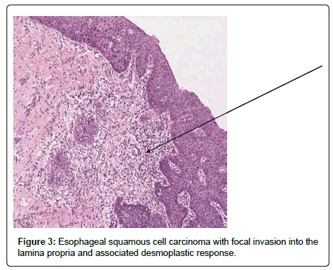 Her case was presented at a multi-disciplinary conference for esophageal diseases and gastrointestinal tumors. Options discussed included continued endoscopic therapy and surveillance, esophagectomy, and radiation therapy and chemotherapy options. Given the multifocal disease and history of failing to respond to endoscopic therapies, the consensus was for an esophagectomy as definitive therapy, and surveillance to the proximal remaining esophageal mucosa left behind to avoid a laryngectomy. It was also decided that if a finding of invasive cancer in the remaining esophageal mucosa should occur, it would prompt radiation or chemotherapy consideration. A repeat round of radiofrequency ablation was performed prior to surgery in the proximal esophagus in order to attempt to clear any dysplasia in the intended area of the anastomosis and allowed to heal. The patient was taken for a minimally invasive three field near total esophagectomy. Pathology of the surgical specimen revealed multifocal high grade dysplasia (Figure 2) and multifocal esophageal squamous cell carcinoma with focal invasion of the muscular is mucosa with associated desmoplastic response (Figures 3 and 4).