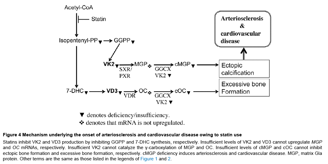 Statins induce VD3 and VK2 deficiencies by inhibiting 7-DHC and GGPP production, respectively, besides inhibiting cholesterol production. Both VD3 and VK2, which up regulate OC and MGP mRNA levels by activating their respective nuclear receptors, play crucial roles in maintaining bone health, glucose homeostasis, and steroidogenesis. Moreover, insufficient levels of GGPP induced by statins cause disturb the secretion of peptide hormones, such as insulin and LH. Deficiencies of these intermediate metabolites of the mevalonate pathway induce type 2 diabetes, arteriosclerosis, cardiovascular disease, osteoporosis, and CKD, and disrupt endocrine function. The biochemical mechanisms of the actions of statins and warfarin reviewed here must be considered when these medicines are prescribed for long-term use.