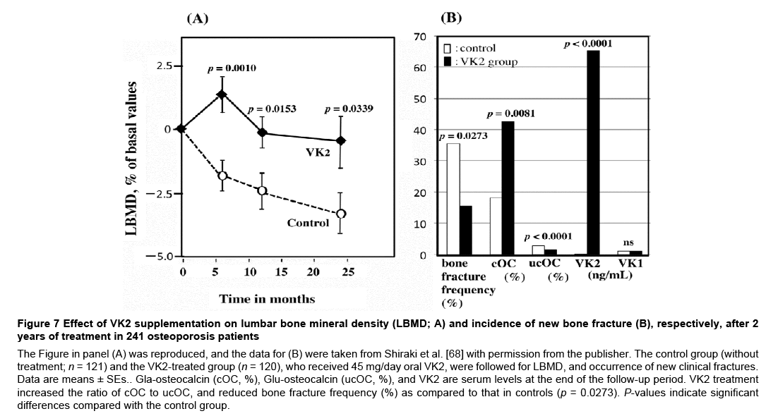 Figure 7: Effect of VK2 supplementation on lumbar bone mineral density (LBMD; A) and incidence of new bone fracture (B), respectively, after 2 years of treatment in 241 osteoporosis patients