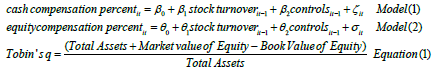 This study employs Model (1)-(2) to reach our research purposes. The dependent variables are cash-based compensation proportion and equity-based compensation proportion. While the cash-based compensation consists of a CEO salary and bonus, the equity-based compensation includes a CEO restricted stocks and stock options [49]. The cash-based compensation proportion divides cash-based compensation by the total compensation. Similarly, equity-based compensation proportion divides equity-based compensation by total compensation. This study uses a lagged independent variable, the stock turnover (stockturnovert-1) to measure the stock liquidity and account for the effect on compensation over time and to avoid potential problems of simultaneity. It is calculated by using common shares traded annually, divided by the average number of annual common shares outstanding [50]. Control variables include firm size, debt leverage, market-to-book ratio, profitability, Tobin’s Q, and the CEO’s characteristic variables (i.e., age, gender, and tenure) at time t-1. The logarithms of net sales at the fiscal year end are used to measure firm size [20]. The leverage is computed using total debt divided by the sum of total debt and the market value of equity [49]. The market-to-book ratio is computed using the market capitalization divided by the book value of equity [49]. The profitability is measured by the operating income before depreciation divided by the total assets [51]. Tobin’s Q is calculated from Equation (1) [52]. The error terms account for other unexplained variances. The proposed models are presented below.