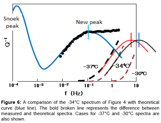 Additionally, NBP requires a continuous variation in vibration frequency over three decades to cover the whole profile as shown in Figures 3 and 4. This suggests that the relaxation peak involves a process with a distribution in the relaxation time. The problem of the anelastic process with a distribution of relaxation time was fully analysed by Nowick and Berry [14]. They gave theoretical values in tabulated form for various distribution parameter β. Figure 5 shows the present spectra superimposed on their theoretical curves. The Snoek peak data taken for Steel-A are close to the β=0 curve. As for NBP, data for FeC-1 measured at -30°C (refer to Figure 3) are close to the β=2 curve. Data for Steel-A measured at -30°C (refer to Figure 4) approximately fit to the β=3 curve. These fittings are regarded as excellent at the left side of NBP. The poor fits on the high-frequency side suggest that another peak might be present at higher frequencies. The -34°C spectrum in Figure 4 is compared with theoretical curve (blue line) in Figure 6. At high frequencies beyond the peak maximum, the measured data exceed the theoretical values. The difference, shown by the bold broken line, is compared with a thin theoretical curve (black line) assuming β=3. This plot indicates another peak at higher frequencies. The residue lines evaluated for -37°C and -30°C spectra are also shown in the figure. They are shifted with regard to frequency in a manner which suggests another peak of thermal activation type.