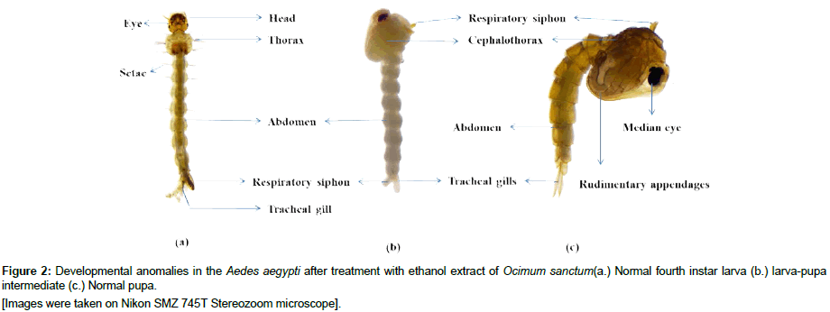 The protocol prescribed by WHO [8] was adopted to conduct bioassay of O. sanctum leaf ethanol extract against fourth instar larvae of A. aegypti. Laboratory reared A. aegypti larvae were used for the larvicidal bioassay. Twenty-five fourth instar larvae were kept in an enamel bowl (capacity 500mL) containing 249 mL of dechlorinated water and 1mL of ethanol leaf extract of O. sanctum. Concentrations of 400 ppm, 200 ppm, 100 ppm and 50 ppm of the extract were used for the bioassay. In control, 1 mL of ethanol was mixed to 249 mL of dechlorinated water. Normal food was provided to the experimental larvae. Mortality in the control and experimental set ups was recorded after 24h of exposure. The experiments were continued to observe day wise mortality, larval duration, and developmental abnormalities in the larvae and the pupae. The various developmental abnormalities were photographed using Nikon SMZ745T stereo zoom microscope The control mortality, if any, was corrected by using Abbott‟s formula [26]. All the experiments, unless specified, were replicated five times.