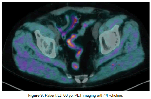 Patient LJ, 60 yo, prostate cancer treated with prostatectomy in 2013. Biochemical relapse, PET with 18F-choline on 30th September 2016 with serum PSA 0.79 ng/ml with no pathologic uptake (Figure 9). Second PET with 68Ga-PSMA on 26th October 2017 with seric PSA 1,56 ng/ml showed pelvic lymph node with strongly increased PSMA uptake (Figure 10).