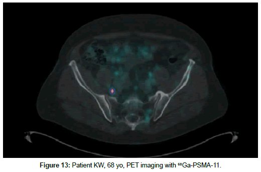 Patient KW, 68 yo, prostate cancer treated with radiotherapy in 2014, biochemical relapse during suppressive therapy with PSA 0,94 ng/ml on 29th December 2016. First PET scan 21th April 2017 positive at pelvic lymph node, with no bone uptake (Figures 11 and 12). Due to rising seric PSA to 31, 88 ng/ml a second PET with 68Ga- PSMA was carried out on 15 September, with confirmation of lymph node metastasis and multiple pathologic bone foci not present at choline imaging (Figures 13 and 14).