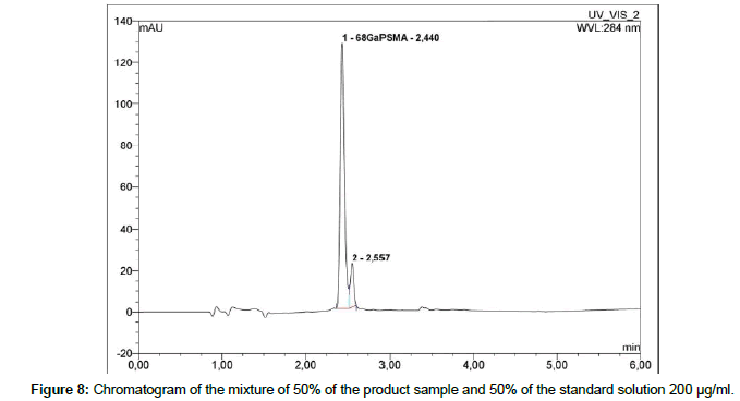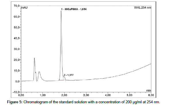 Liquid chromatography: To determine radiochemical and chemical purity of 68Ga-PSMA a reversed-Phase HPLC with Chromolith Performance RP-18e column; 100 x 4.6 mm (Merck) is used. The HPLC system is Thermo Fisher Dionex Ultimate 3000 equipped with on-line degasser, UV and radiometric (Bioscan B-FC- 1000) detectors. Measurement is carried out in linear A-B gradient (0 % B to 100 % B) at flow rate 4 ml/min. Solvent A consist of 0,1 % aqueous trifluoroacetic acid (TFA) and solvent B is 0,1 % TFA in acetonitrile [19]. UV absorbance is measured at wavelength 254.0 nm and 284.0 nm. The injection volume is 50 μl. All of obtained chromatograms were compared with natGaPSMA standard solution. To find the best concentration of the standard solution, 1 mg of natGaPSMA-11 (ABX, Radeberg, Germany) was dissolved in 1 ml (1:1 v/v CH3CN/H2O) and from this stock the solutions with following concentrations were prepared: 50 μg/ml, 100 μg/ml and 200 μg/ml. Three standard solutions with concentrations of 50 μg/ ml (Figure 2); 100 μg/ml (Figure 3) and 200 μg/ml (Figure 4) were analyzed during the study with an UV detector at 284 nm. As it is seen on the recorded chromatograms, the best results were given from solution containing 200 μg/ml of natGaPSMA. Therefore, it was decided to record one more chromatogram with use of the 200 μg/ml standard solution at 254 nm (Figure 5) [7]. The better results were obtained during the measurements at a wavelength of 284 nm and that is why it was decided to measure the 68Ga-labeled PSMA-11 peptide at this wavelength.