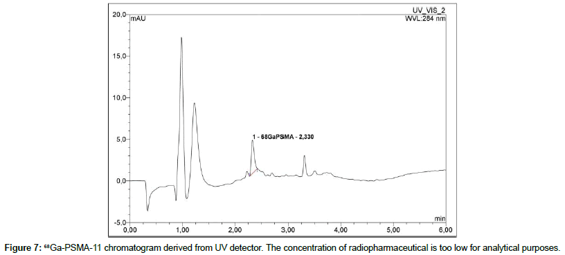 68Ga-labeled PSMA peptide is analyzed with an UV detector at 284 nm and a radiometric detector. During the tests it was found that the concentration of 68Ga-PSMA in the sample diluted with a saline is below the detection limit of radiometric detector (synthesis product is diluted with saline to provide isotonicity). Therefore, for the further analysis the undiluted product is used. There are two signals that can be observed in the obtained chromatograms in a ratio of approximately 82%/12%. The more intense signal comes from 68Ga- PSMA-11, the second signal comes from its less thermodynamically stable diastereomer and does not affect the test result (Figure 6). These signals can be observed both on the UV detector and the radiometric detector. However, the concentration of 68Ga-PSMA-11 in the test sample is too low to obtain a reliable result on the UV detector (Figure 7).