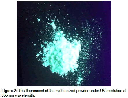 The scintillator powder produced under a UV light exposure showed a light glow color which indicates successful doping of the silver in the crystal lattice. Figure 2 shows the fluorescent glow of the synthesized powder under 366 nm UV light excitation wavelength. As observed in Figure 2, the color glow seems to be an indication that the activator has been doped in the ZnS crystal lattice.