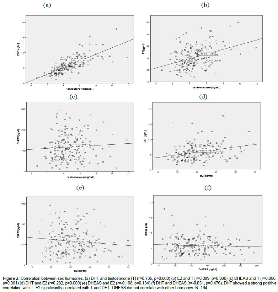 T showed a positive significant correlation with E2 (r=0.399, p=0.000) and a strong correlation with DHT (r=0.735, p=0.000). DHT also correlated with E2 (0.282, p=0.000). DHEAS did not show any correlation with other hormones (T(r=0.066, p=0.361), DHT(r=-0.051, 0.476), E2(r=-0.108, p=0.134)).