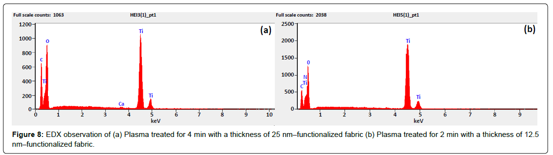 The Figure 7 presents the SEM/EDX analysis of the hydrolyzed and hydrolyzed–functionalized PES fabric. As it can be seen from Figure 7 (a), hydrolyzed PES fabric without any treatment does not present any Ti, however the presence of TiO2 on the fabric is shown after hydrolysis and functionalization with CNC/TiO2.