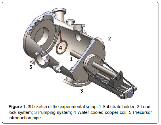 ii. Plasma treatment: Cyclopropylamine Plasma Polymer Films (CPPF) were deposited on the PES fabric to obtain stable amine function at the surface. The deposition chamber consists of a cylindrical stainless steel vacuum chamber (35.5 cm in diameter and 86.5 cm in length) equipped with a rotary pump (Varian Triscroll 600) and a turbomolecular pump (Oerlikon Leybold Vacuum MAG W 600 iP/L) connected in series, allowing to reach a residual pressure of 6.6x10-4 Pa, as measured by a full-range gauge (Figure 1). The liquid precursor (Cyclopropylamine ≥ 98.0% purity supplied from Sigma–Aldrich) was introduced in the chamber using a mass flow controller and an introduction system (Omicron) entirely heated at 323 K (container, tubes and connectors). During the process, the working pressure was accurately regulated by a throttle valve controlled by a capacitive gauge. The water-cooled copper coil (4.5 cm internal diameter and 0.7 cm thickness) was located in front of the substrate and connected to a RF power supply (13. MHz, Advanced Energy Cesar 1310) via a matching network (Advanced Energy VM1000A). The distance between the coil and the substrate was fixed at 13 cm. The substrates were introduced under vacuum through a load-lock system, and then transferred to the deposition chamber using a transfer stick. CPPF were synthesized using both Continuous Wave (CW) at 40W. All the experiments were made exclusively in the inductive mode, with the working pressure and the precursor flow rate fixed at 5.33 Pa and 5 sccm, respectively. Table 1 presents the parameters, i.e. pressure, power, debit, time and thickness, for the treatment. The treatment time and thickness were modified to analyze the influence on the efficiency. For each method, three samples were tested.