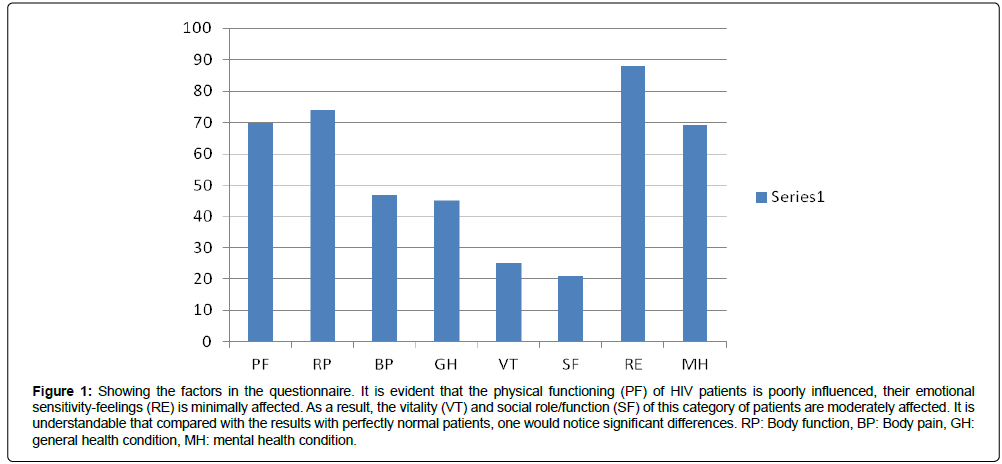 Figure 1: Showing the factors in the questionnaire. It is evident that the physical functioning (PF) of HIV patients is poorly influenced, their emotional sensitivity-feelings (RE) is minimally affected. As a result, the vitality (VT) and social role/function (SF) of this category of patients are moderately affected. It is understandable that compared with the results with perfectly normal patients, one would notice significant differences. RP: Body function, BP: Body pain, GH: general health condition, MH: mental health condition.