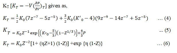 Using equations (4), (5) and (6) we can obtain the expression for K'T= (∂KT⁄∂P) the first derivative of isothermal bulk modulus at pressure P given as