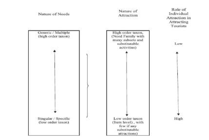 However, McKercher and Koh believe that an attractions/needs relationship framework to understand the role of individual attractions plays the role to draw tourists to a destination. They tested McKercher’s attraction hierarchy model in the boundary of pearce's travel career pattern model as discussed above. It demonstrates the relationship between the number and (relating uniquely) to a particular need and the corresponding number, specificity and alterability or changeability of different attraction sets that can satisfy those needs. The graph also elucidates that if requirements are solely designed and kept specific, then either individual attractions or narrow attraction sets play a vital role in the trip decision (Figure 3).