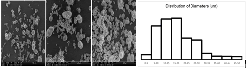 An analysis of 770 particles revealed an average diameter of 18.6 um ± 11.2 um with a range of 2.9 um-94.0 um, indicating a large polydispersity. The histogram below shows the frequency distribution of particle diameters. The micro particles are spherical and have a smooth surface, indicative that there is negligible API present on their surface. There is some material which does not appear to be particles. Energy dispersive X-ray spectroscopy determined material is not lidocaine or dexamethasone, implying it is likely PLGA as shown in Figure 1 (Figure 1).