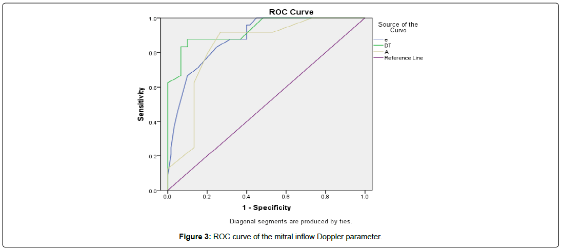 The Doppler study done at the baseline echocardiography, showed many statistically significant differences between both groups regarding the A, E/A and DT values, where the A wave was lower in the R+ than the R- group (67.5 ± 2.5 and 74.2 ± 2.5 respectively, with a p value of˂0.0001), the E/A ratio was higher in the R+ than the R- group (1.2 ± 0.03 and 1.08 ± 0.08 respectively, with a p value of˂0.0001), and the DT was less in the R+ than the R- group (151.8 ± 8.8 and 183.1 ± 6.8 respectively, with a p value of˂0.0001). There was no statistically significant difference in the E wave value between both subgroups.