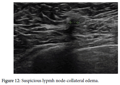 Axillary lymph nodes have a precisely described image on ultrasound. A benign node has an oval shape, an L/T ratio greater than 2, it has a preserved hyper echoic fatty hilum [1-3,8,9,10,12], its cortex is thin and regular, and there is polar type of vascularization (from the hilum). A clearly pathological lymph node is enlarged, hypo echoic, with no fatty hilum, and with peripheral vascularization (Figures 1-5) on an ultrasound image [1,3,4,8-11]. In the case of so-called “reactive nodes” of benign origin, the sonographic appearance may be different. These nodes may have an irregularly distributed cortex (Figure 6), sometimes with focal thickening or with cortical bulge (Figures 7-10), or inhomogeneity in an otherwise hypo echoic cortex [1,2,9,12-14], but usually the fatty hilum and the polar type of vascularization remain. The node may be small but round and hypo echoic, and the L/T ratio is abnormal (Figure 11). If found in patients without breast cancer and if side-symmetrical, these nodes are usually not considered suspicious. Another situation occurs when the finding of a node with an irregularly distributed cortex or with a cortical bulge is one-sided and there is an already known cancer diagnosis in the ipsilateral breast. These signs should be viewed in correlation with the contralateral axilla, including aggressiveness and size of the breast tumor. In this case, it also depends on the experience of the investigating radiologist whether or not he or she will evaluate the node as suspicious and order biopsy. Sometimes, a hyper echoic rim around the node (Figure 12) that corresponds to edema [9,12] may be a clue to performing biopsy. Biopsy should be indicated if the nodes are pathological, have a cortex wider than 4 mm, the hilum is diminished or the nodes are round and their L/T ratio is less than 2 (Figure 11). In some cases of breast cancer and clearly pathological nodes in the ipsilateral axilla, we leave the decision whether or not to perform node biopsy up to the oncologist. For instance, in cases where distant metastases of breast cancer have been confirmed and primary breast cancer has been confirmed locally, it is not necessary to verify pathological nodes in the ipsilateral axilla.
