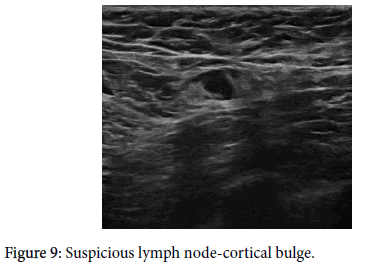 An ultrasonographic image of a pathological lymph node is based on the development of metastases that are deposited sub cortically [3] and then hypo echoic cortex becomes expanded on ultrasonographic features. The fatty hilum of the lymph node disappears (Figures 1 and 2). Metastases in the cortex are hyper vascularized; therefore, there is a peripheral type of vascularization in the lymph node on Doppler imaging.